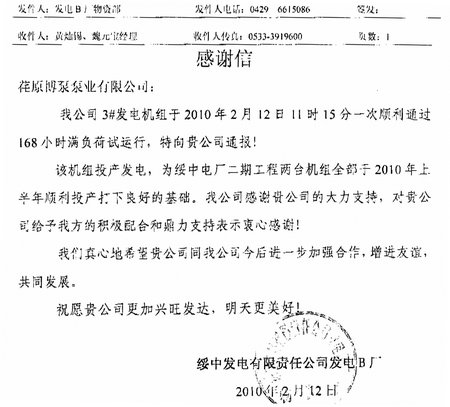2009年9月27日8時(shí),海門(mén)一期4 *1000MW國(guó)產(chǎn)臨界機(jī)組,#2機(jī)圓滿(mǎn)完成了168小時(shí)滿(mǎn)負(fù)荷運(yùn)行,順利投產(chǎn)發(fā)電。海門(mén)電廠特地為我公司發(fā)來(lái)感謝函,對(duì)我公司的優(yōu)良服務(wù)表示感謝。海門(mén)一期4 *1